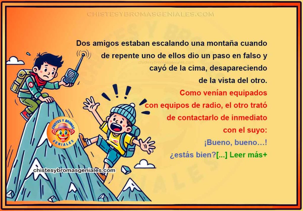 ️ ¡No te pierdas el chiste de los amigos escaladores! Un hombre cae de la montaña mientras su amigo le sigue hablando por radio. ¡Ríete con nosotros! #Humor #Chistes #Risas #ChistesDeAventuras #Divertido #AnécdotasGraciosas #SituacionesCómicas