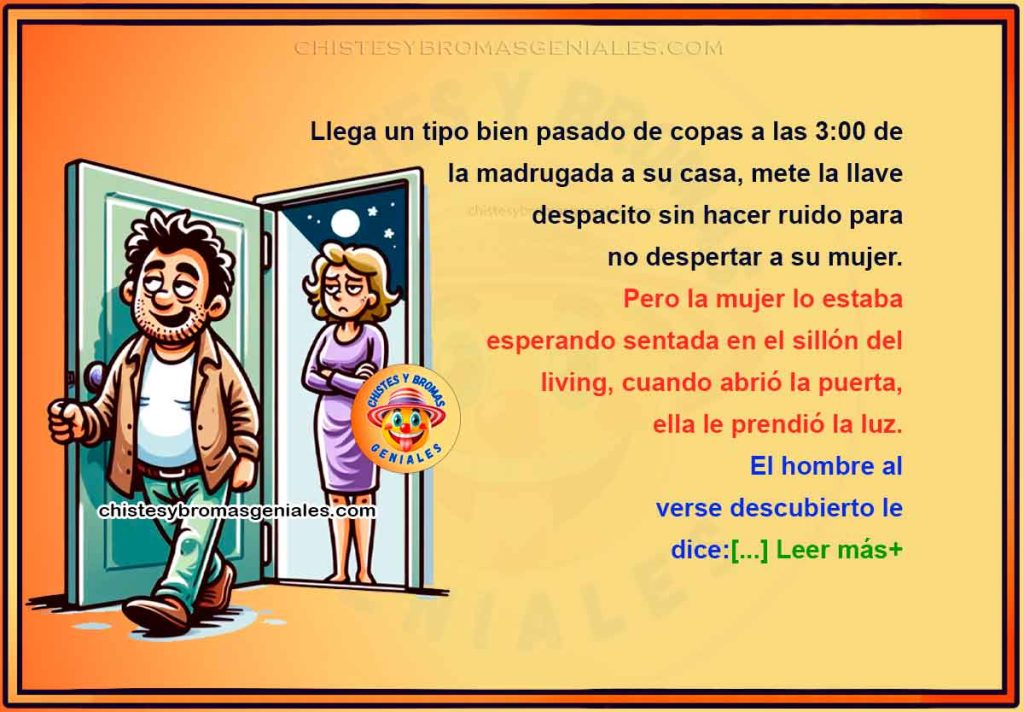 Los chistes sobre situaciones cotidianas, como llegar a casa después de una noche de copas, siempre sacan una sonrisa. Este chiste nos cuenta la historia de un hombre pasado de copas que intenta esquivar una confrontación con su esposa de una manera bastante peculiar y cómica. ¡Prepárate para reír con esta divertida anécdota!