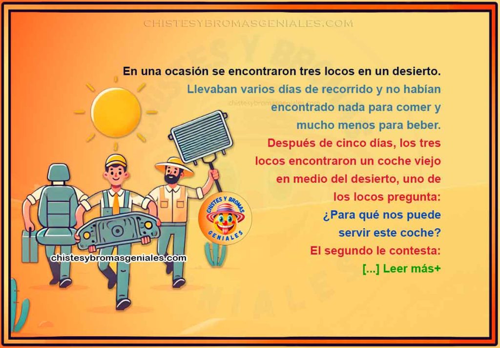 ️ ¡No te pierdas el chiste de los tres locos en el desierto! Encuentran un coche y cada uno tiene una idea ingeniosa para usar las piezas. ¡Ríete con nosotros! #Humor #Chistes #Risas #ChistesDivertidos #Divertido #AnécdotasGraciosas #SituacionesCómicas